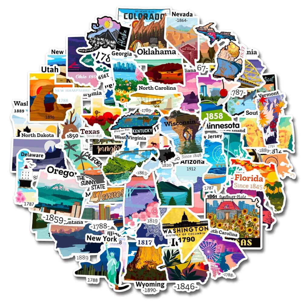 Pack de 50 Stickers Américains pour Customiser Votre Bagage et apporter une touche personnellle. Les autocollants résistent aux voyages répétés et mettent en avant les charmants États des USA.